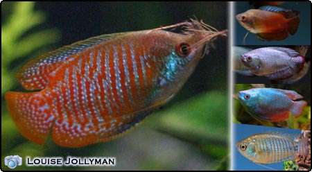 I had to move him because I watched him slowly nip away to NOTHING the pectoral fins of my 2 new dwarf gourami fish. They're so pretty, and I love the little characters they have; for instance they swim to the top when they are ready to eat and they will follow my finger along the glass of the tank. One of them is like the main picture, and the other is like the one on the top of the column to the right.